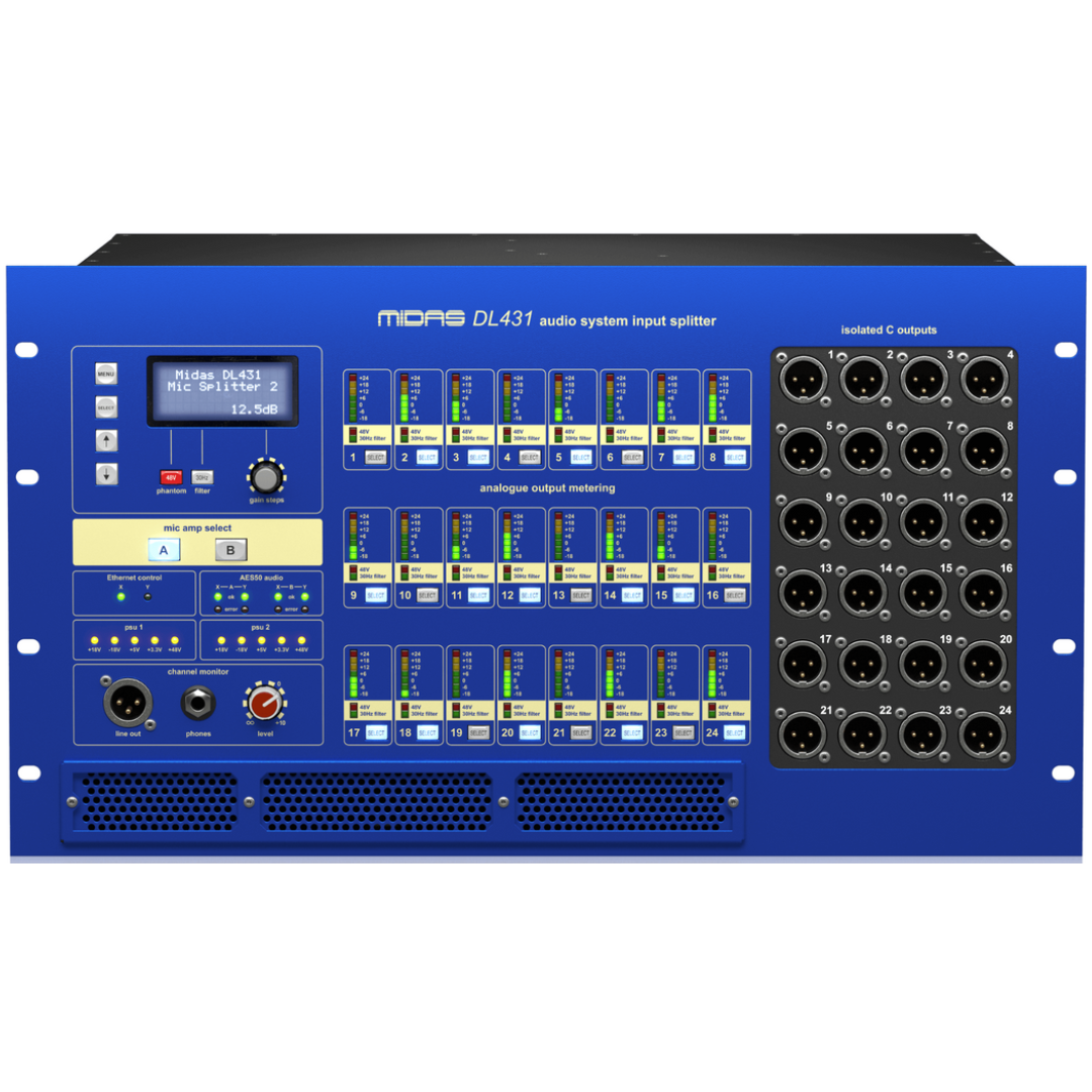 Midas MDS-DL431 is a premium-grade 6U input splitter unit offering 24 mic/line inputs, each with three independent preamps—two with remote gain control and one fixed-gain path. Designed for complex stage, broadcast, or recording environments, it features both analog and AES50 digital outputs, enabling simultaneous feeds to FOH, monitor world, and broadcast or recording systems.