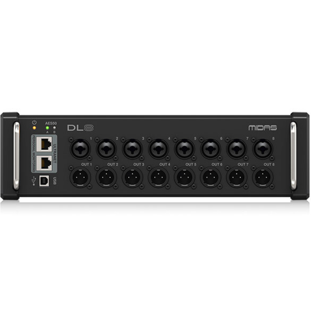 DL8 provides a highly portable and feature-rich I/O solution for live sound professionals and installers. Equipped with 8 of Midas’s award-winning PRO mic preamps with switchable 48V phantom power, and 8 low-impedance, electronically balanced line outputs, this stagebox delivers the signature Midas sound in a small, rackmountable form factor.